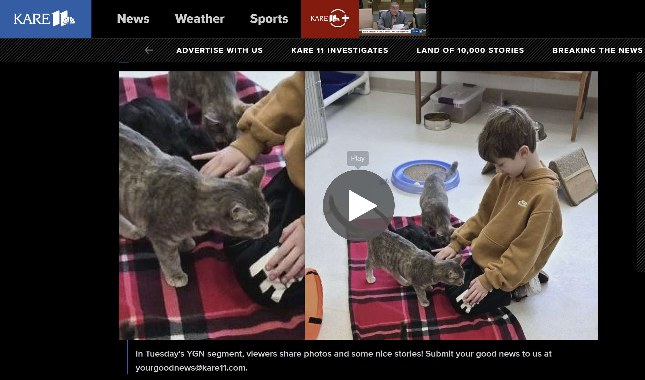 We were thrilled to be featured in today’s Good News segment on the Kare11 news at 4:00 pm in Minneapolis – St. Paul. Thank you to the Kare11 team for showcasing the fun summer our kittens had and the need for them to find forever homes this fall!