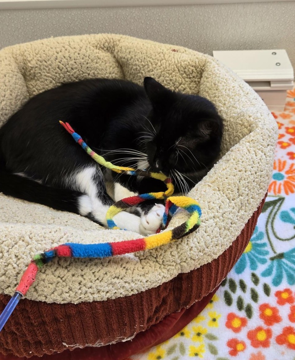 Now she’s back at the shelter, ready for her forever family. She’s free from pain and enjoys playing with her roommates.
